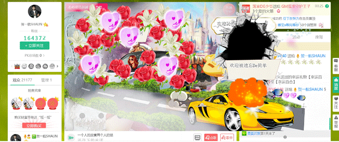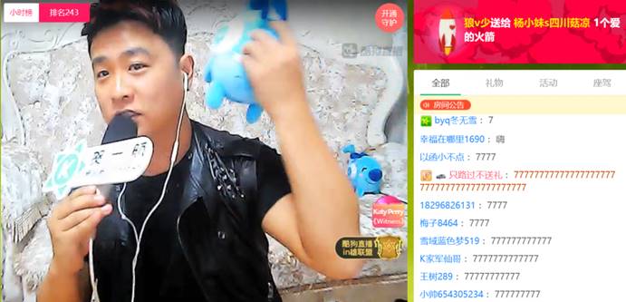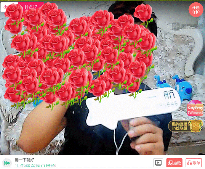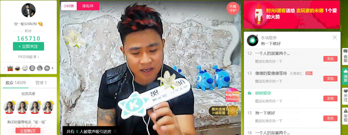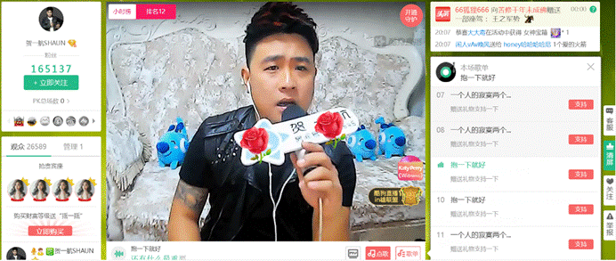 贺一航都还没出现,助理调试麦克风的时候礼物已经刷屏。小编不得不佩服这强大的号召力。20点整,贺一航准时出现,但是前三分钟想看到他完整的脸还是有点困难的: