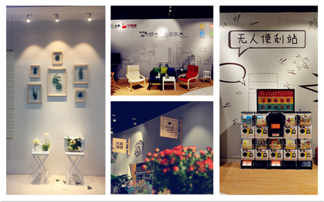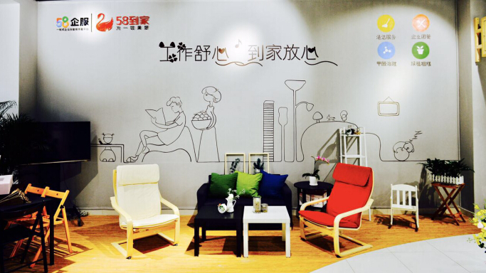 手绘的墙面,小巧的旧物回收和改装,白色蒲公英、实木的长条桌和高脚椅、欧美风格的沙发椅、特色有趣的“不扫码墙“、实木复古花架、简约茶几、几何花房摆件、精致而舒适。服务品牌不仅包含咔嚓快照、乐乐好花艺、58企服、小马快修、无人便利店、USTA澳思塔洗衣等百个项目的专业服务。