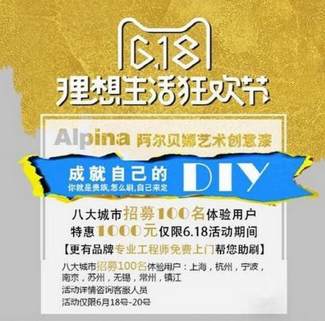 据悉,活动期间(6月18-20日),为培养国内消费者对自主涂刷、艺术涂刷的认知及好感度,Alpina阿尔贝娜特推出上门助刷内测体验活动。消费者凡购买三款艺术涂料且住所位于指定八大城市内,即可享受品牌专业工程师免费上门助刷服务,活动仅限100名。