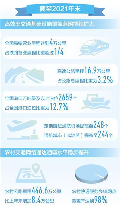 高效率交通基础设施覆盖范围持续扩大。截至2021年末,全国高铁营业里程达到4万公里,占铁路营业里程比重超过1/4。高速公路里程16.9万公里,比上年末增加8090公里,占公路总里程比重为3.2%,呈现稳步提高态势。全国港口万吨级及以上泊位2659个、增加67个,占全国港口泊位比重为12.7%、提高1个百分点。定期航班通航机场、通航城市(或地区)分别提高至248个和244个。