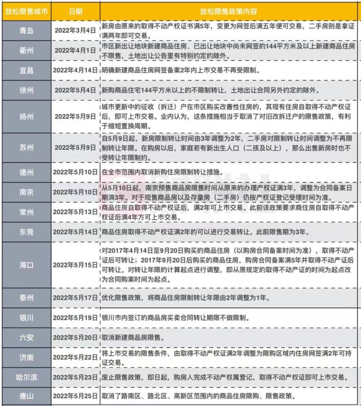 不只是唐山,据中指院统计,截至5月25日,已有20城取消限售或缩短限售年限。