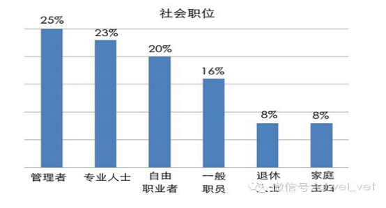 在这些养宠人群中,最多的是管理者占25%,专业人士占23%,自由职业者占20%,一般职员占16%,百分比相差都不大,而退休人士和家庭主妇最少,分别占8%。