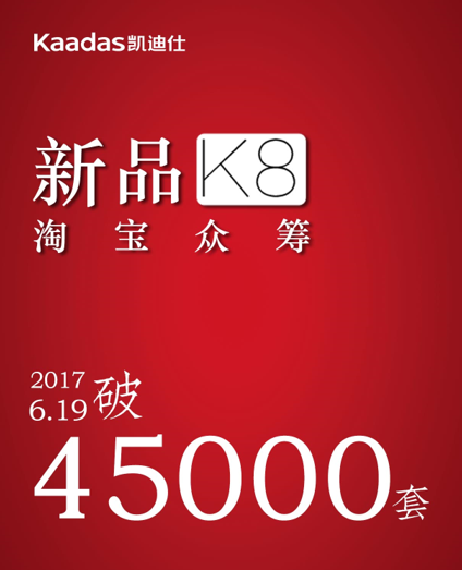 - 6月19日,为期月余的Kaadas凯迪仕新一代蓝牙推拉智能锁K8淘宝众筹战绩传来捷报。时隔7个月后,凯迪仕凭借堪称完美的新品K8,再次征服了各位消费者的心,总众筹量高达45,000套,再度创造淘宝众筹类目新纪录,同时也创造了新的全球众筹类目纪录,凯迪仕不负众望,成功卫冕众筹界双冠王称号!