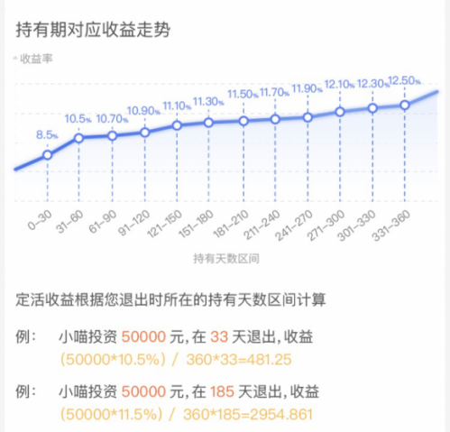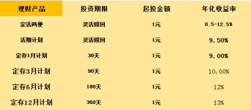 整体来看,旺财猫的产品利率在优质平台中也是有很大优势的,产品周期更是科学合理,适合不同资金流动需求的投资者,定存12月期的利息最高为13%;投资兼具活期流动性与定存高收益性的定活两便,持有达到360天也可获得12.5%的年化收益,根据下表可以掌握定活两便的收益情况,灵活投资。
