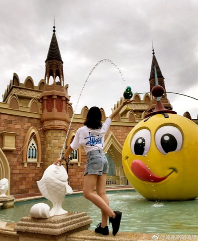 我们发现,很多游客在入园后,第一时间就是找球仔的形象合影留念,对于在园区内走街串巷的活的球仔玩偶,他们更是进行了趣味互动。